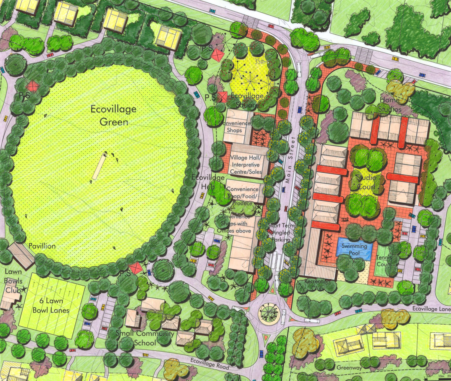 In the growing retirement city of Hervey Bay in coastal Queensland, we planned a development like this. The plan allows for living options from an extended family size, down to a single bedroom above a shop. It provides work from home, and work from studio using satellite and fiber optic communications. It reinstates the old paperbark wetland as an active ecology and harvests water off roads, playing fields and roofs to provide a water balance within the site when combined with a local brown water waste treatment plant. No pipes or kerbs on the laneways. A waste distribution centre would sort waste locally for reuse, and a nearby men’s shed would provide the retirees with a place to work and play.