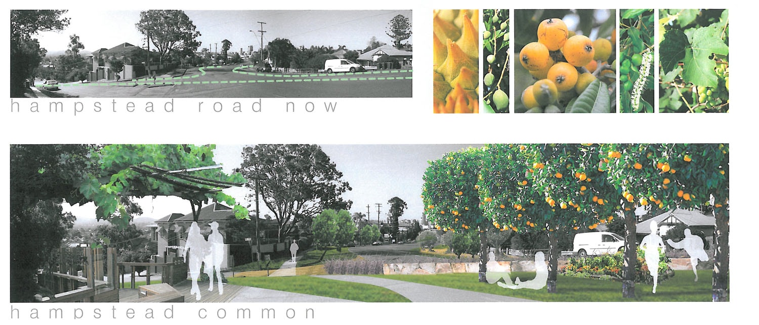 Council is not planning one single new park for the new populace, or for any traffic management for all the new cars. A group called The Local Push began lobbying for a better lifestyle and infrastructure deal for the locals. We imagined that we could carve parks and food orchards out of unused asphalt, much as we had done to build our little town square ten years earlier. We could begin on Hampstead Road, which could be retrofitted to become Hampstead Common, a kilometre of productive community gardens. Parkland out of unused crown land, funded by developer contributions.