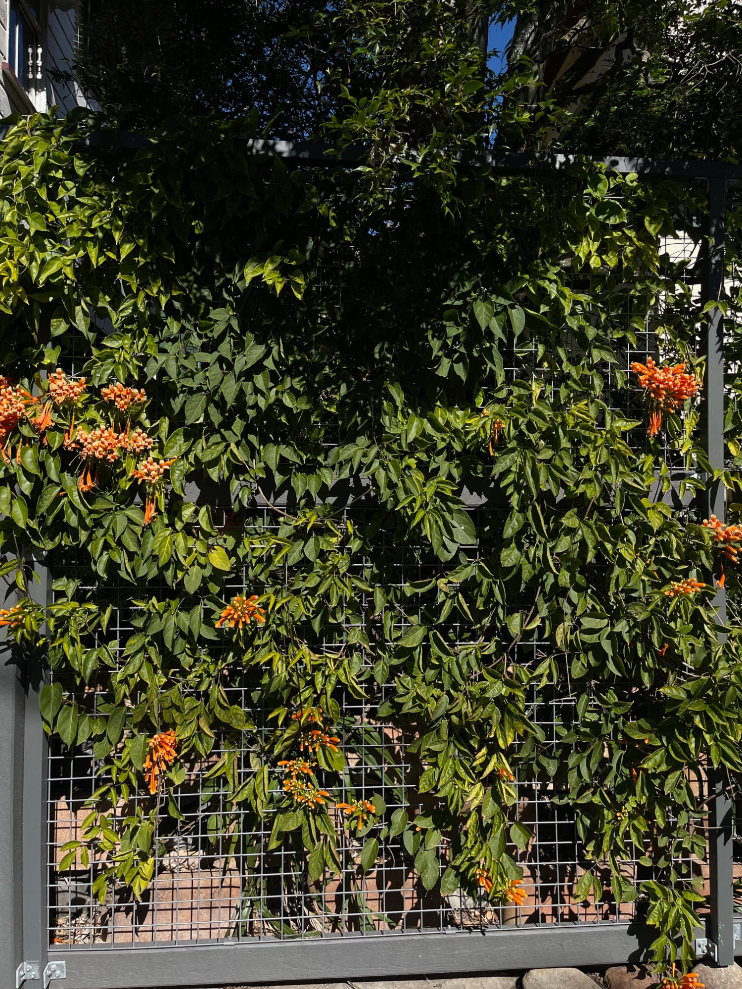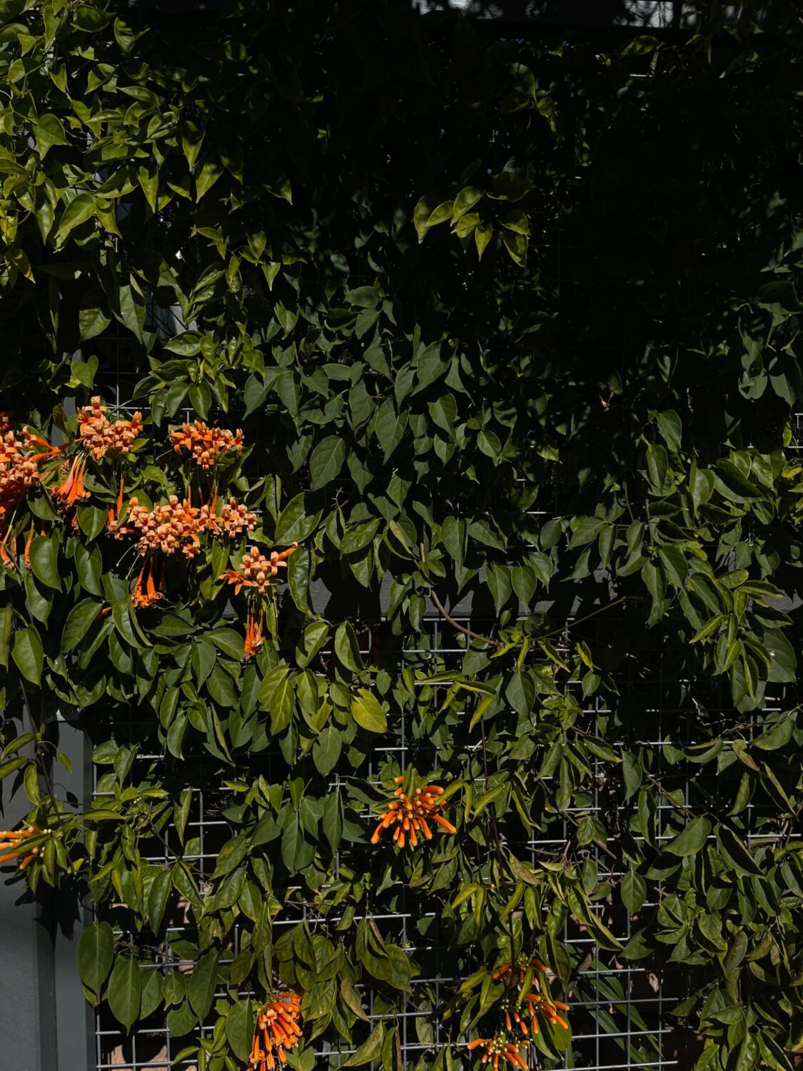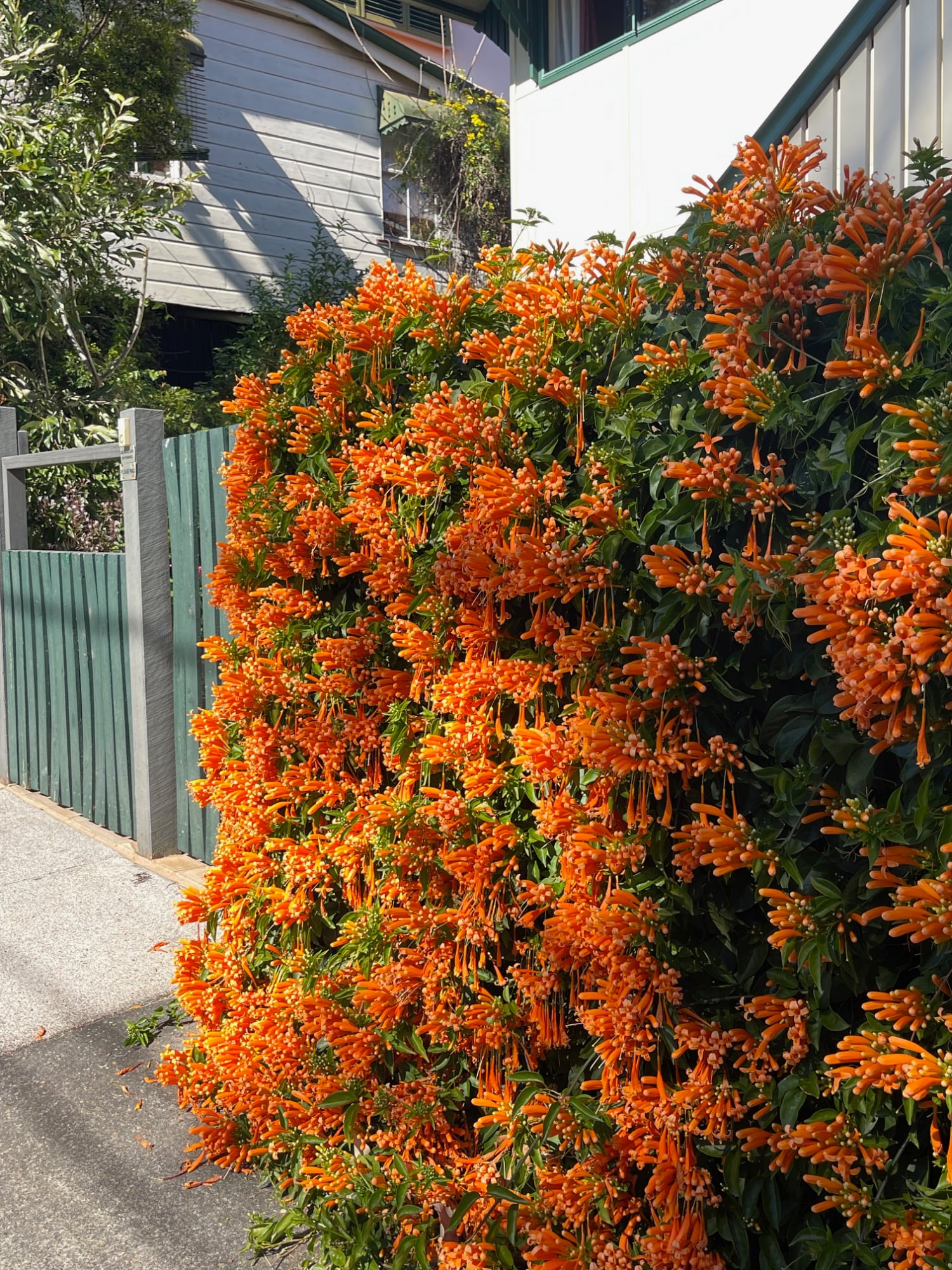 This Kurilpa Garden designed by JMLA in Brisbane showcases orange trumpet vine from Chile (Pyrostegia venusta) which literally takes over the street with its dramatic flowering.